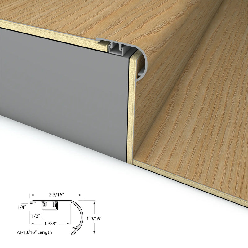 It creates a safe, finished transition and stair edge while matching your luxury vinyl floors for a clean designer look.